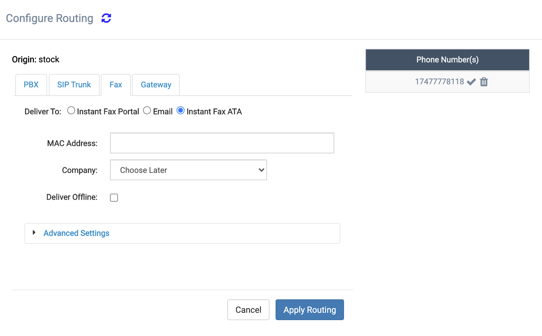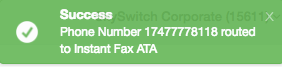 - After clicking on ‘Apply Routing’, you should see a success message showing that the number has been routed. Upon routing, the configuration file for the ATA is built on the Fax server.