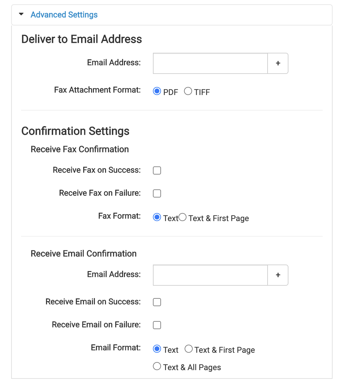 - Confirmation Settings – this section is used for setting up how a confirmation message will be sent whether via fax, email, or both for when the delivery of a fax is successful or not. The format for the confirmation can also be set to Text, Text & First Page, and Text & All Pages (for email confirmation only).